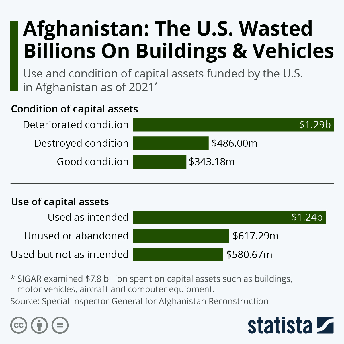 The report does not specifically look at the withdrawal in 2021 but does give an estimate of what the U.S. left behind. The U.S. left about $38.6 billion behind in military equipment and infrastructure built by the U.S.